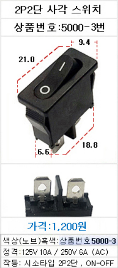 21.0 x 9.4mm, 작동: 시소타입 2P2단 On-Off, 노브색상: 흑색