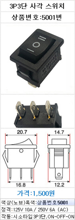 작동: 시소타입, 3P3단 ON-OFF-ON, 노브색상: 흑색