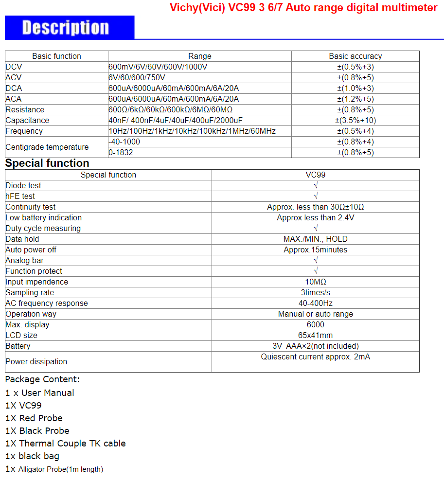 Voltage: 600㎷~1㎸, Capacitance: 40㎋~2000㎌, Resistance: 600Ω~60M, Current: 600㎂~20A, Frequency: 10㎐~60㎒