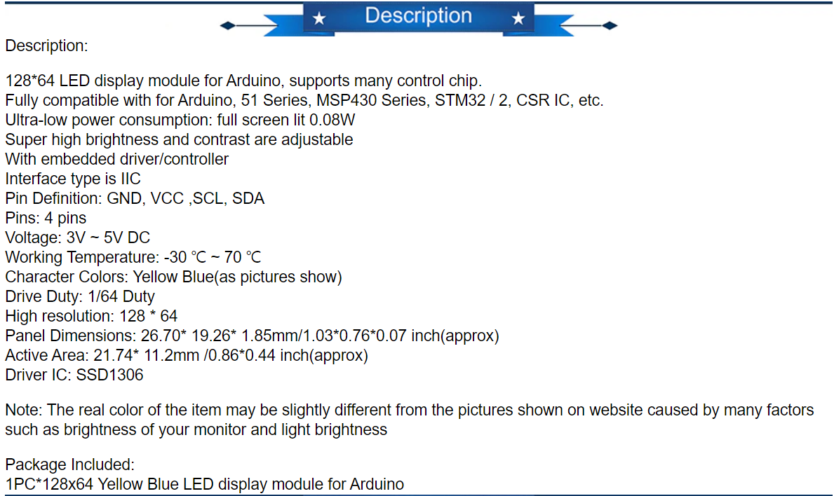 3~5V DC, Panel Dimensions: 26.70*19.26*1.85mm/1.03*0.76*0.07inch(approx), Active Area: 21.74*11.2mm /0.86*0.44inch(approx), Driver IC: SSD1306 Fully compatible with for Arduino, 51 Series, MSP430 Series, STM32 / 2, CSR IC, etc.